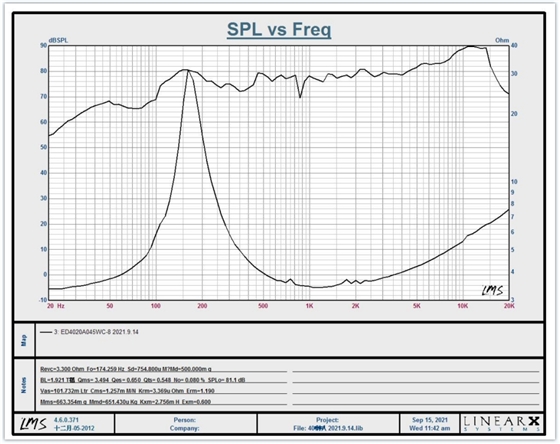 在这张图中,阻抗的范围是 3 Ohm 到 40 Ohm。这条线表明喇叭的负载特性,帮助工程师判断如何设计音箱和功放电路。